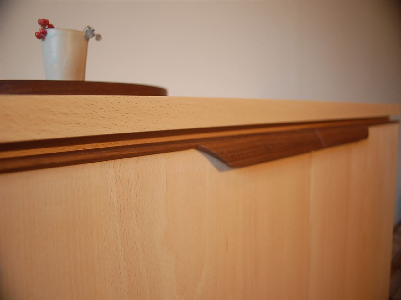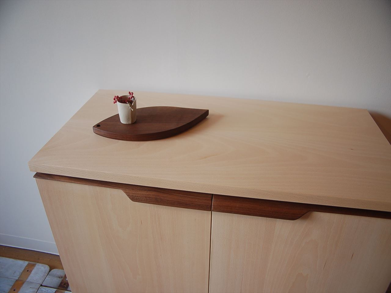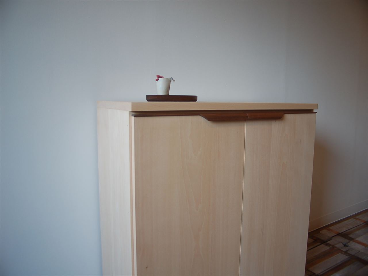 上段と下段が分かれているブナのくつ箱です。ブラックウォールナットをアクセントとして、上段は埋め木に下段は取っ手に使いました。
