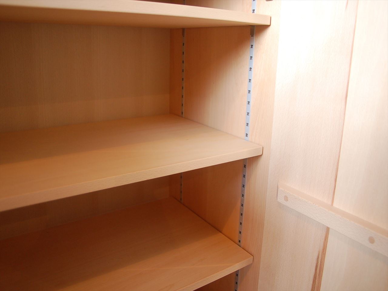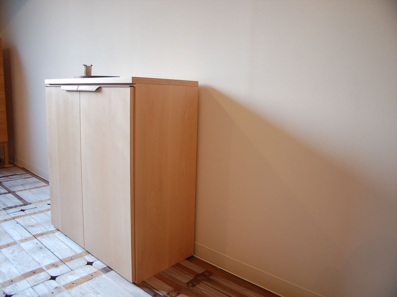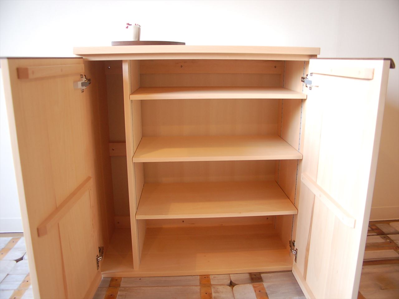 上段と下段が分かれているブナのくつ箱です。ブラックウォールナットをアクセントとして、上段は埋め木に下段は取っ手に使いました。